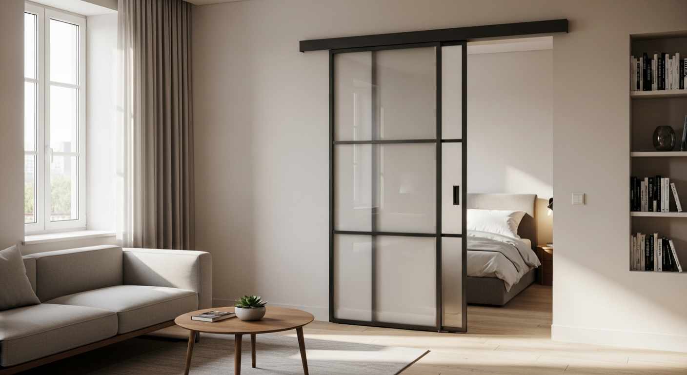 Pintu ayun (swing door) memakan banyak ruang putar. Ganti dengan pintu geser untuk kamar mandi atau lemari. Ini adalah solusi brilian untuk apartemen studio karena dapat menghemat hingga $1 m^2$ ruang lantai yang terbuang.