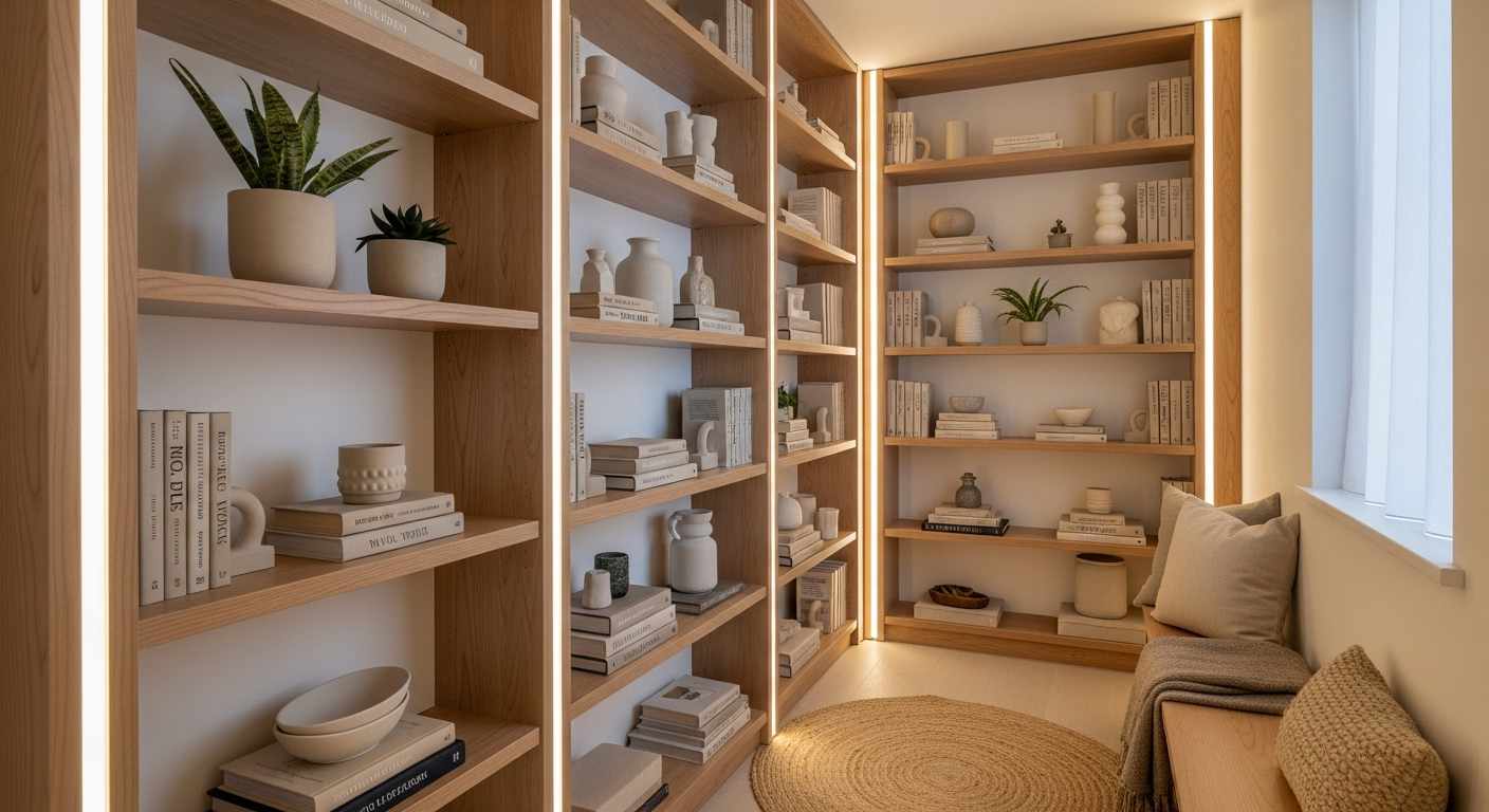 Manfaatkan ruang dinding hingga ke plafon. Daripada rak buku pendek, gunakan rak buku tinggi dan ramping. Penyimpanan vertikal menarik pandangan mata ke atas, menambah ketinggian visual, dan menghemat ruang lantai.