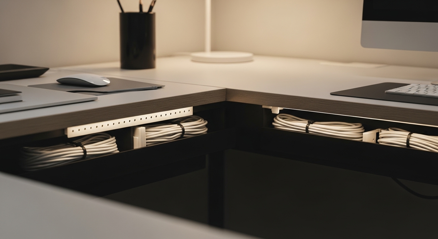 Tidak ada yang lebih merusak estetika daripada kabel yang berantakan. Manfaatkan lubang kabel di meja, cable ties (pengikat kabel), atau selongsong kabel yang menempel di bawah meja untuk menyembunyikan semua kabel.